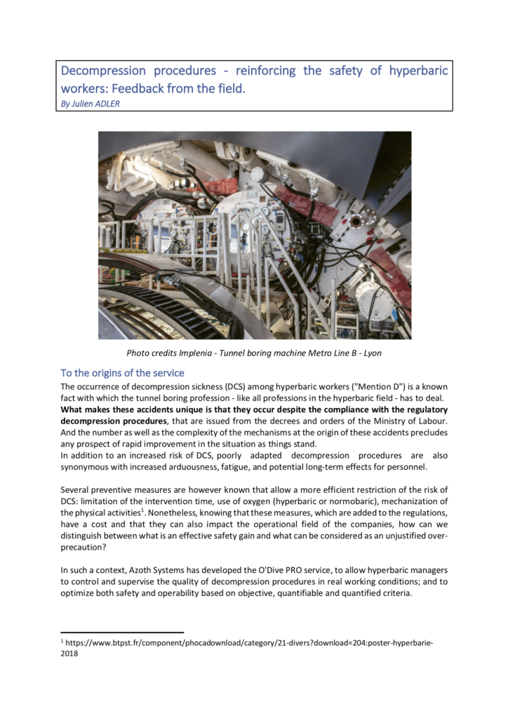 The O’Dive system – which was well received by the teams on site – confirmed the presence of sometimes high levels of decompression bubbles in the responders, despite the compliance with theprocedures. The interest in monitoring the operators is therefore real.
