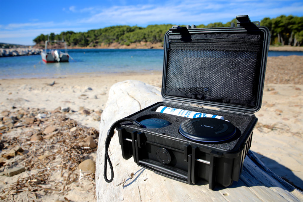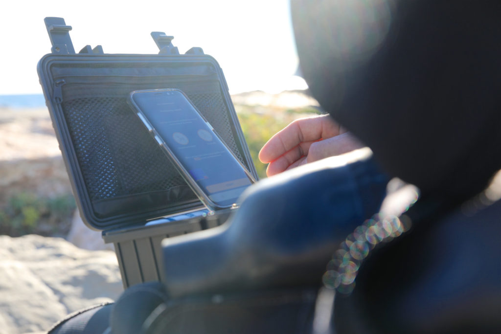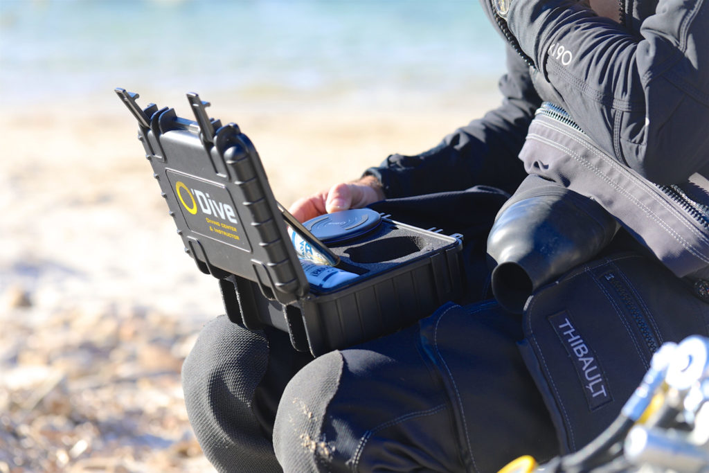The waterproof case contains the O’Dive sensor with a wireless charger and ultrasound gel. By downloading the O’Dive app to your smartphone you can create a personal account.