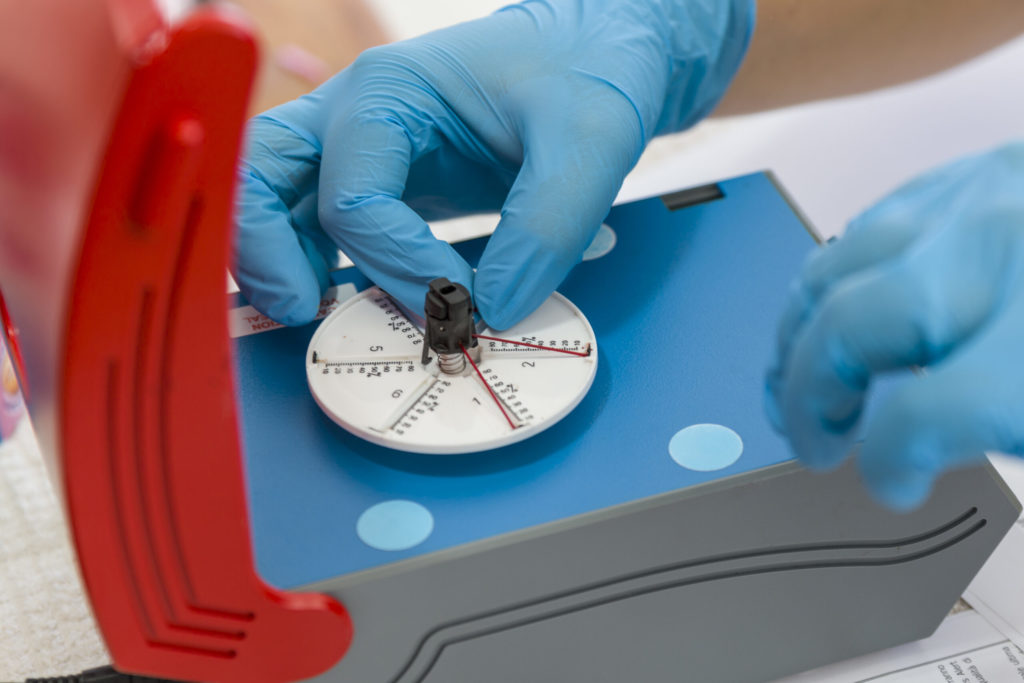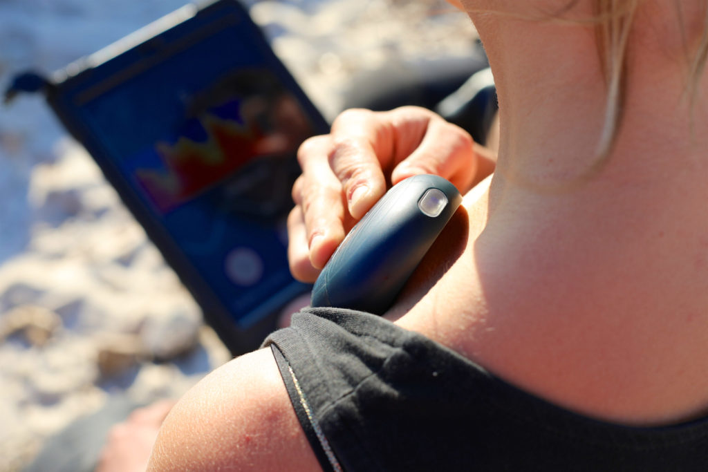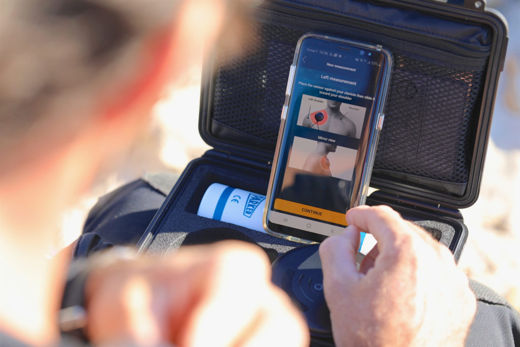 The sensor, which pairs with the app via Wi-Fi, is shaped like a hockey puck with a groove designed to fit snugly around the collarbone. The graphic display in the app lets you know if the sensor’s positioning is correct. Once the signal is confirmed, the app directs the diver to inhale and exhale for 20 seconds while the sensor records. When the measurement is complete, it directs the diver to repeat the operation on the right side.