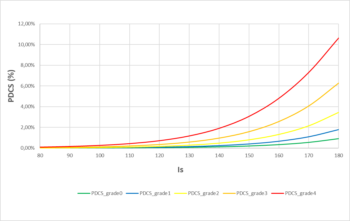 À titre indicatif, l’analyse statistique montre avec un bon niveau de confiance que pour un indice inférieur à 75%, le risque est supérieur à 2/1000 ; pour un indice inférieur à 50 %, il est supérieur à 1% (bornes a minima du risque).