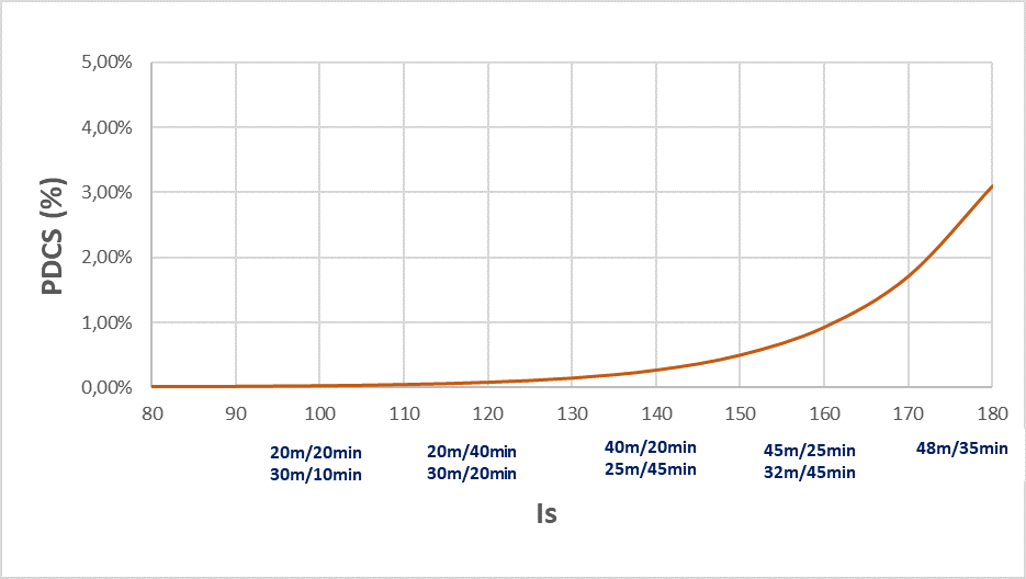 Figure 3 – Loi de probabilité d’ADD (PDCS) en fonction d’un indice de sévérité Is prenant en compte la profondeur, la durée de la plongée et la durée totale de décompression. Les exemples de paramètres sont exprimés en temps fond/Profondeur maximale pour des profils carrés air.