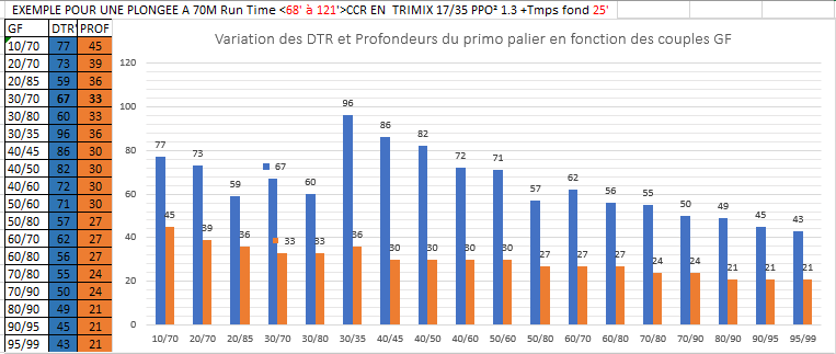 Figure 2 – Dispersion des profondeurs des premiers paliers et durée de la décompression en fonction des GF pour une plongée de 25’ à 70m au Trimix