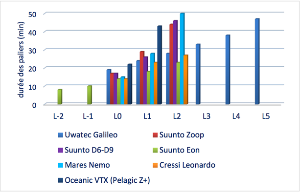 Figure 1 – Illustration de la variabilité des durées de décompression proposées par des ordinateurs du marché, avec divers réglages (Rapport de thèse pour le titre d’instructeur national – S. Le Maout, 2015)