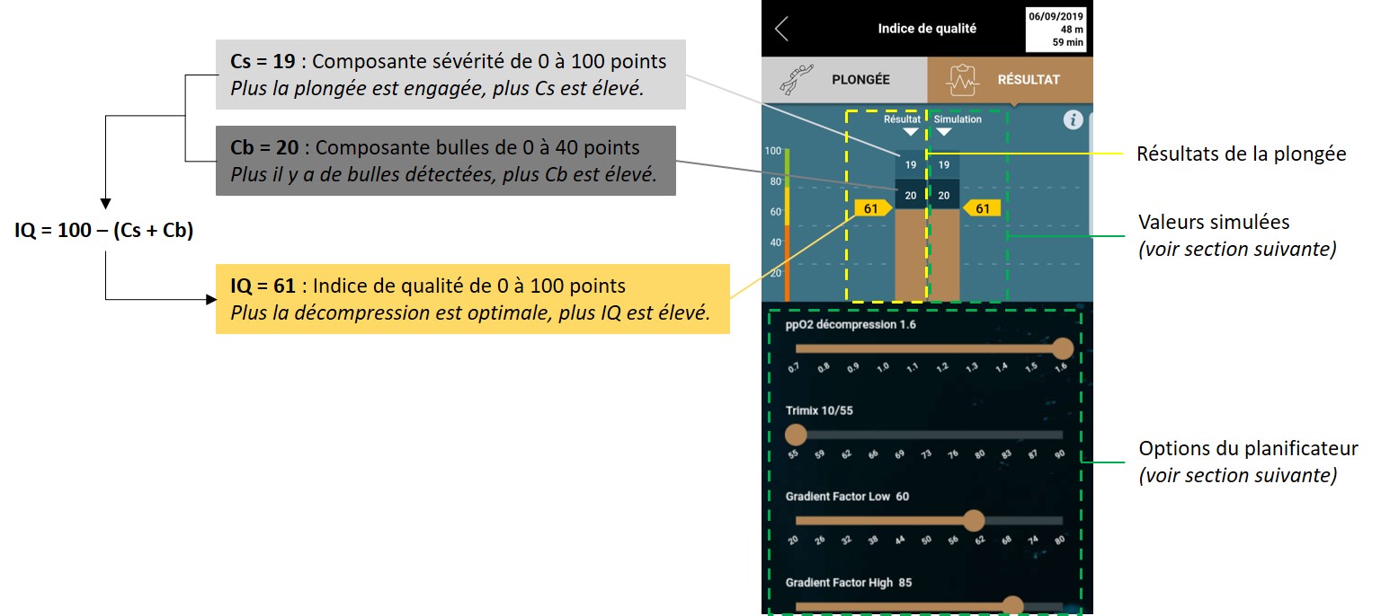 En l’occurrence, l’indice de qualité IQ a été élaboré de telle sorte que lorsque qu’il augmente de 33%, le niveau de sécurité du plongeur est multiplié par 10. Ce gain sur la sécurité est affiché dans la fenêtre de simulation.