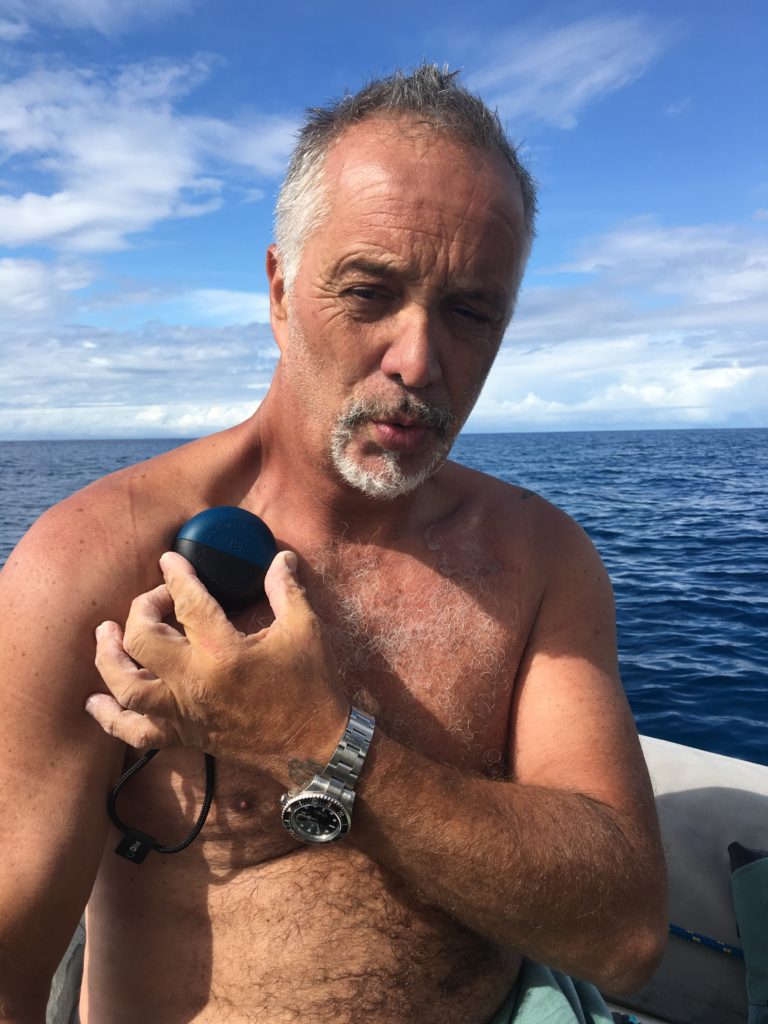 Ci-contre, Aldo Ferrucci – directeur de plongée du programme – se monitorant à l’aide de notre capteur O’Dive.