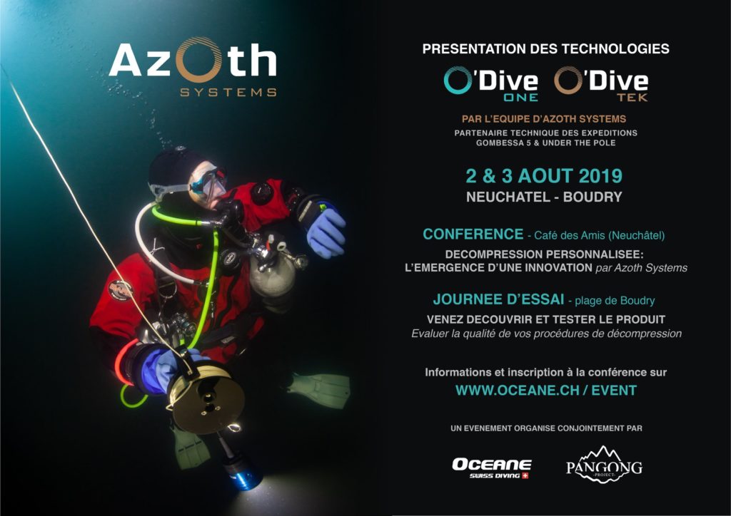 Azoth Systems sera présent à Neuchâtel pour une conférence sur la décompression personnalisée (vendredi 2/08 soir, sur inscription) suivie d’une journée d’essai le 3/08 de O’Dive One et O’Dive Tek (plage de Boudry).