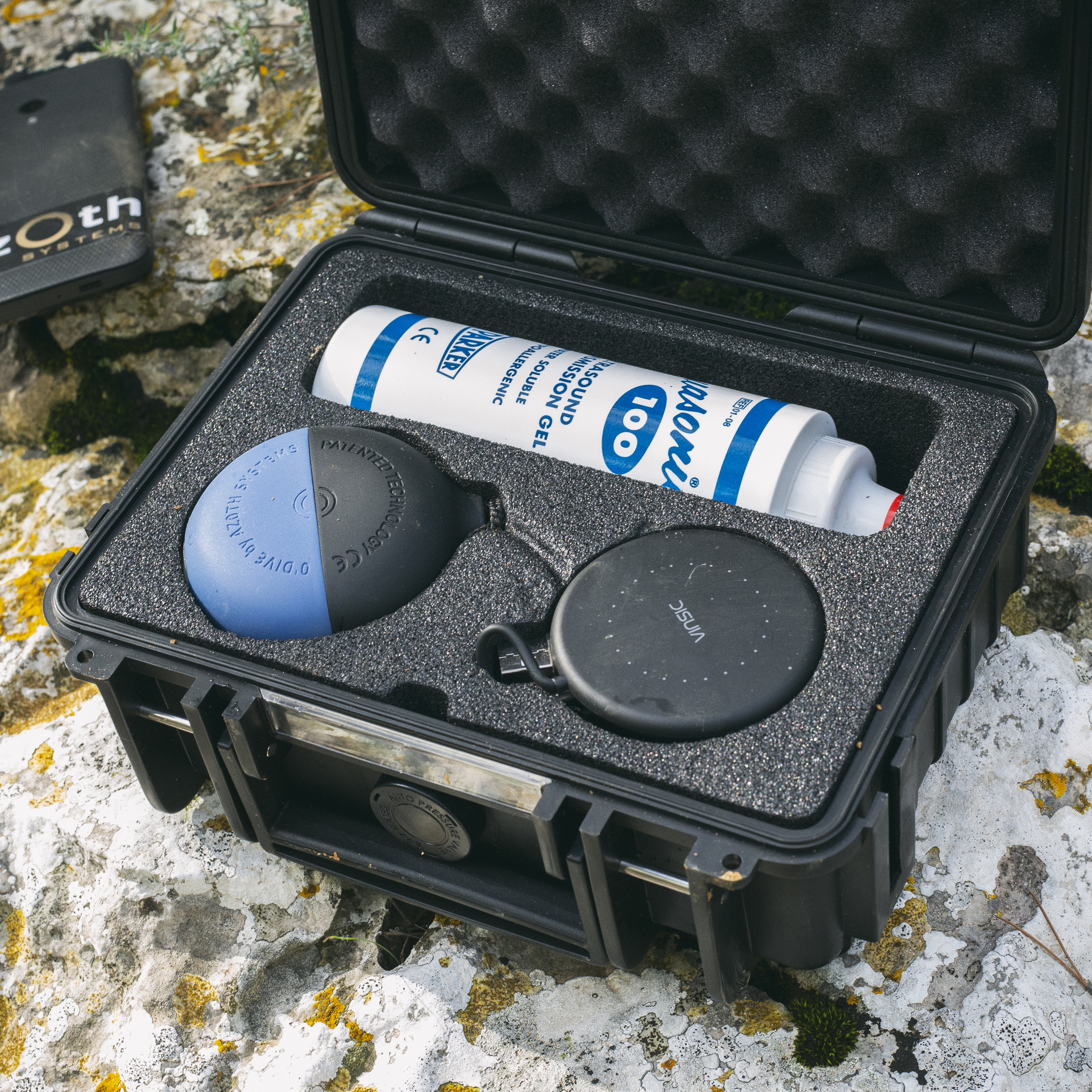 O’Dive comprend un capteur de microbulles vasculaires (technologie Doppler à ultrasons) à la fois robuste, compact et connecté à un serveur doté de moyens d’analyse spécialisés.
