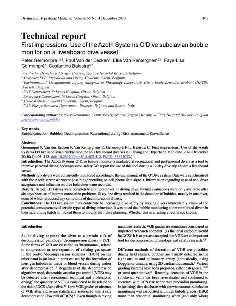 Le docteur Peter Germonpré du Centre d’Oxygénothérapie Hyperbare de Bruxelles (Belgique) et le professeur Costantino Balestra ont publié dans le Diving and Hyperbaric Medecine un article décrivant leur expérience du capteur O’Dive au cours d’une croisière de 12 jours.